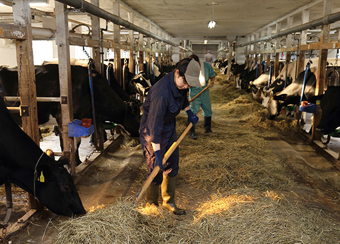 先輩と一緒に現場に入り、搾乳や餌やり、清掃などの基本作業を習得します。